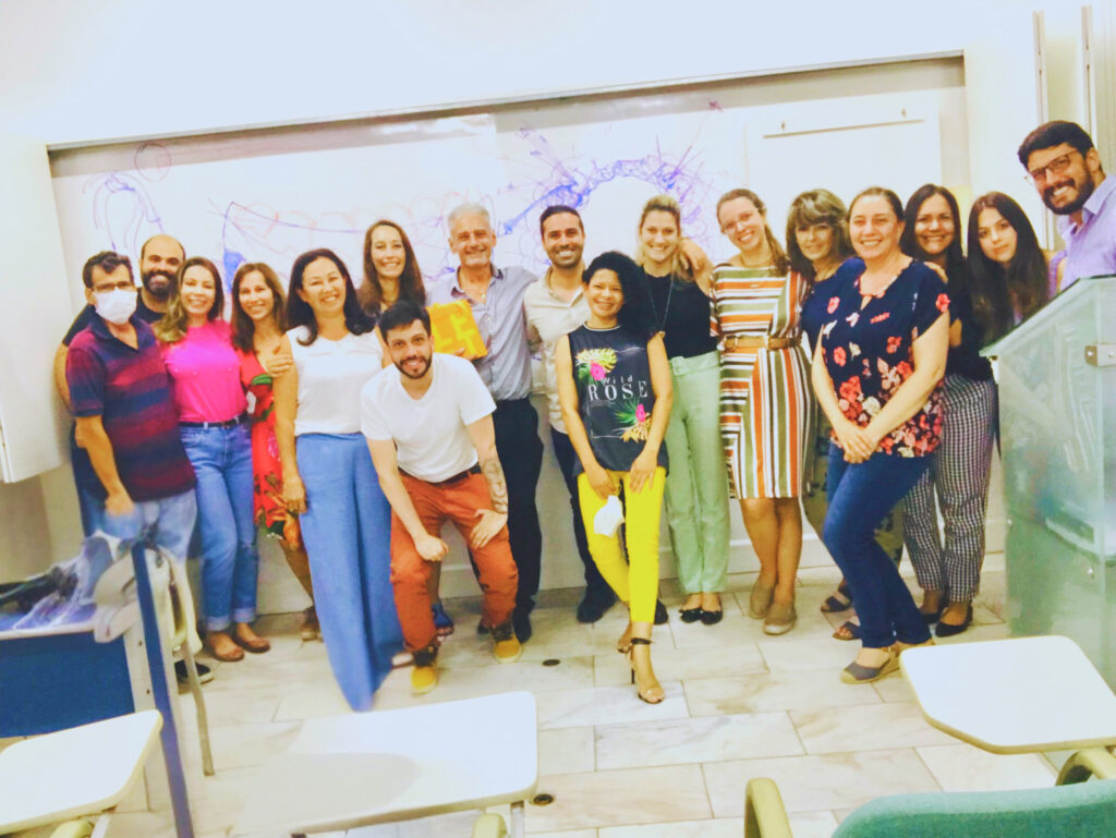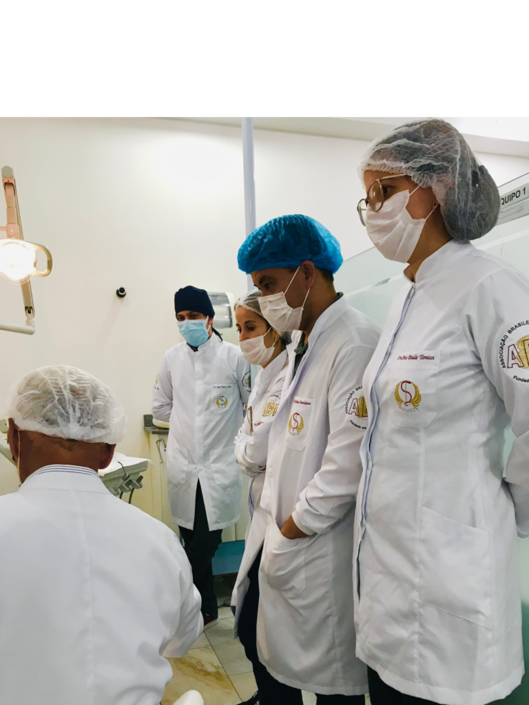 Quando o aprendizado vira história| Registro de encerramento de aula da Especialização em DTM e Dor Orofacial da ABD, reunindo alunos, residentes e colaboradores ao lado do professor Libório José Faria, em um momento que simboliza a conclusão de um módulo e o fortalecimento do aprendizado clínico. Na imagem estão presentes os residentes à época Dr. Pedro Fiscina, Dr. Arthur Furukawa e Dra. Maria Carolina Machado. Também aparecem alunos da especialização: Jorge, Marlon Carvalho, Laís Gomes, Tatiane Guinsburg, Larissa, Vandressa De Marco, além de Margarida Maruki e Cíntia Maruki, mãe e filha que compartilharam juntas essa formação. A imagem inclui ainda Beth Rodrigues, integrante da turma desde o início. Compõem o registro Francisco D. Chaves ,TPD, que participa mensalmente das atividades como colaborador convidado, auxiliando alunos na integração clínica-laboratorial e a Dra. Carolina, responsável pelo acompanhamento ortodôntico dos pacientes da ABD após o tratamento das disfunções temporomandibulares. A fotografia marca um período de transição pós-pandemia, quando o uso de máscaras começava a ser deixado para trás, e registra um gesto simbólico de reconhecimento: um presente de Páscoa entregue ao professor, representando gratidão, afeto e encerramento de ciclo. Mais do que um grupo reunido, esta imagem preserva a memória viva da formação, das relações construídas e do ensino transmitido ao longo da história da ABD.